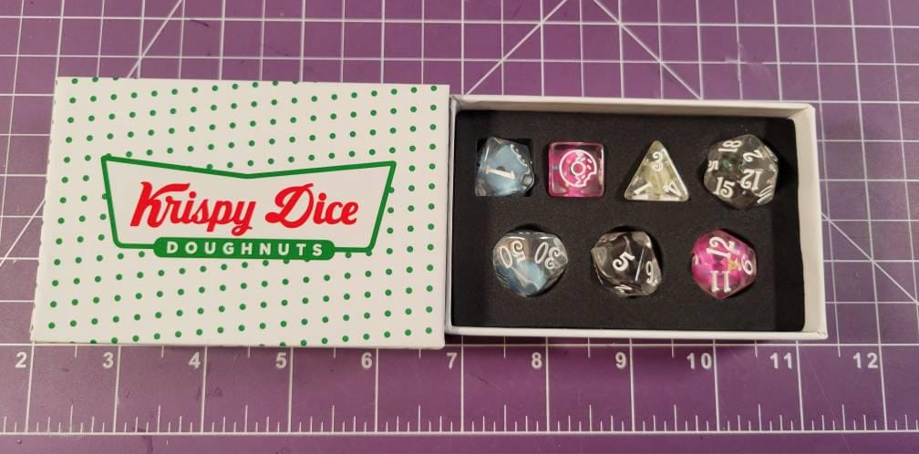 Unleash your imagination with this delightfully themed seven-piece dice set, inspired by the look of fresh, sugary treats and packaged in a Krispy Dice Box — a charming homage to the iconic Krispy Kreme aesthetic.